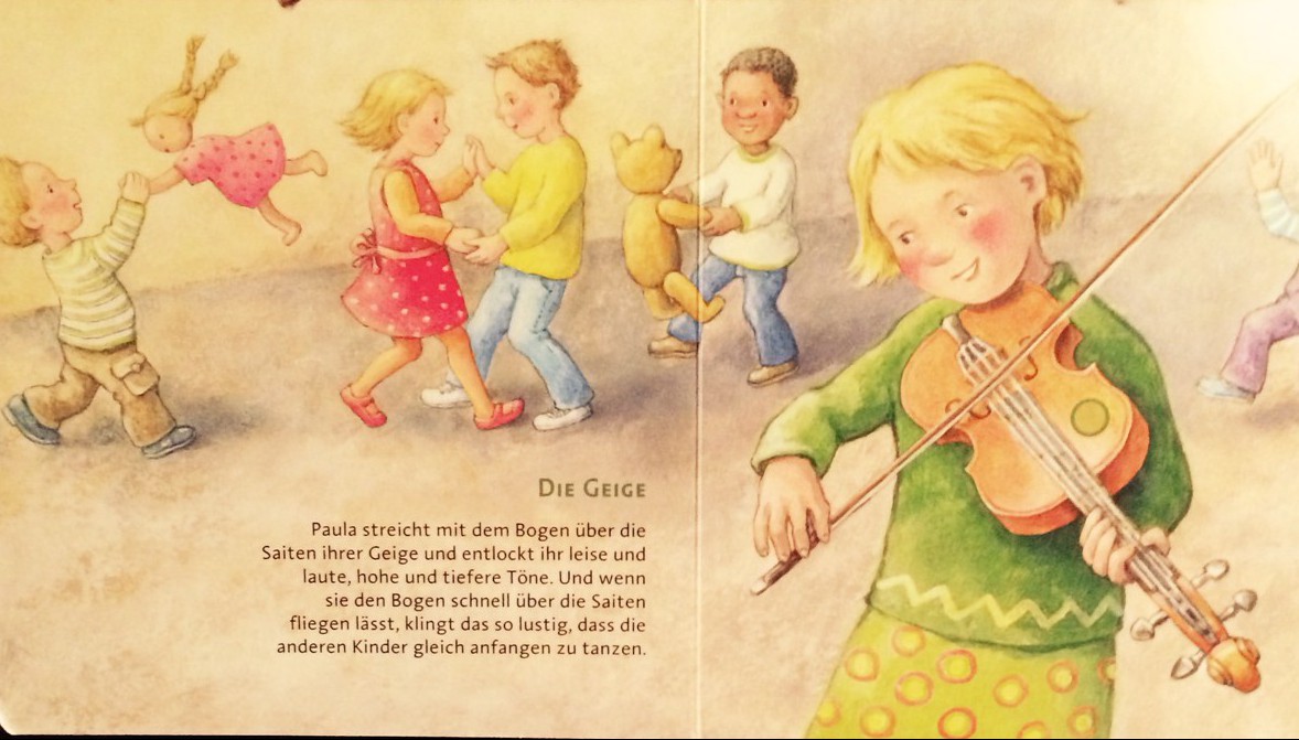 In “Unsere Msuik” gibt es sechs Aufnahmen von echten Instrumente zu hören: Geige, Flöte, Harfe, Trommeln, Trompeten und Glockenspiel. Schön illustriert und für die Kleinsten vom unwiderstehichen Reiz, etwas zu bewirken! Außerdem eine schöne Aternative für all jene, die ihrem Nachwuchs den Klang einer Harfe ansonsten nicht im heimischen Wohnzimmer vorspielen könnten.